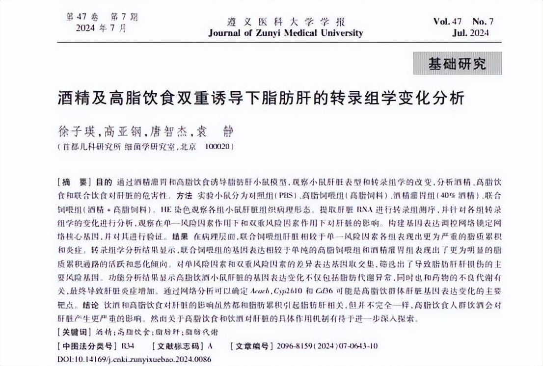 [1]徐子瑛.酒精及高脂饮食双重诱导下脂肪肝的转录组学变化分析, 遵义医科大学学报, 2024-07-30